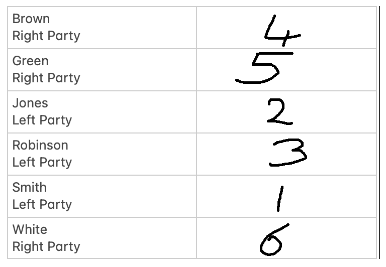So when a voter in this hypothetical town goes into the polling booth their ballot paper has six names, and they rank them in order (and although the mechanics of counting STV votes are complicated, its use by voters is really simple). A staunchly pro-Left voter will write 1, 2 and 3 against the Left candidates and 4, 5 and 6 against the Right candidates: a pro-Right voter will do the reverse. In doing so they are not only expressing their allegiance to a party, they are also expressing their preference for the candidates within that party. And that preference carries through to the result.